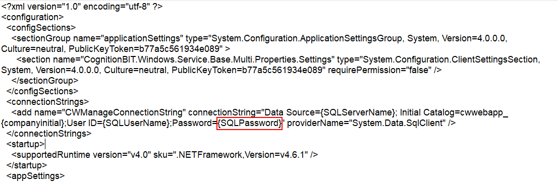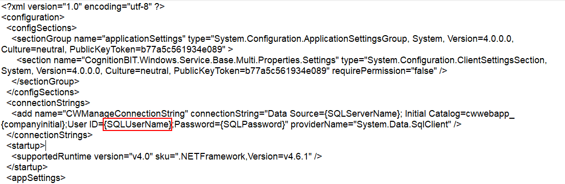 {SQLServerName}; Initial Catalog=cwwebapp_{companyinitial};User ID={SQLUserName};Password={SQLPassword}" providerName="System.Data.SqlClient" /