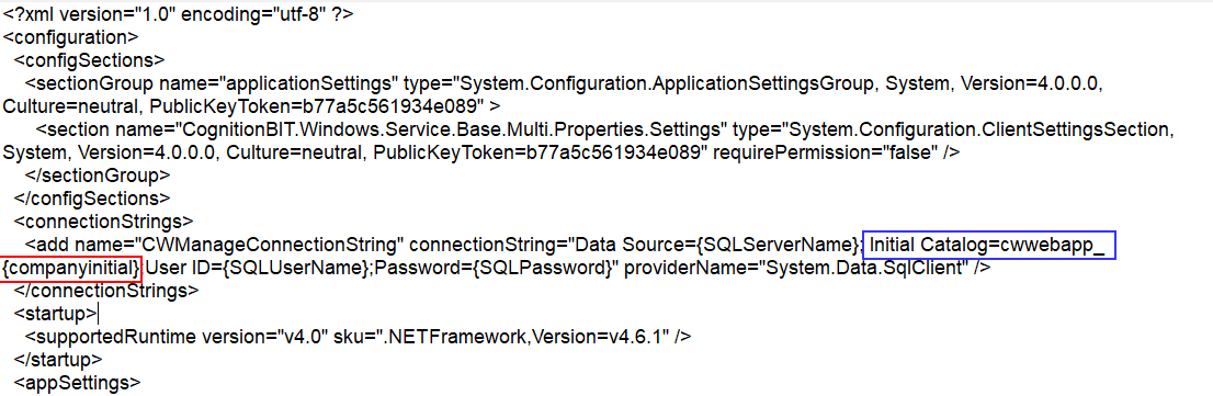 In the first few lines of the Config File you will see a section called configuration. The "initial catalog" string starts with "cwwebapp_" if this is not the case for you, please correct this. Replace the value in the example below "{companyinitial}" with the correct details.
