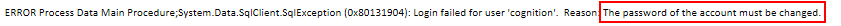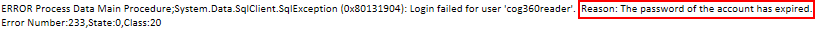 Please reset the password and set it to 'not expire' to avoid this problem from recurring. Please note: if you are updating the password in SQL, you will also have to update the password in the config file.