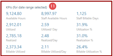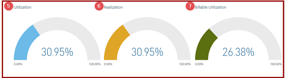 The gauges represented by numbers 6,7 and 8 shows the overall percentage captured against Utilization, Realization and Billable Utilization for the selected team/s.