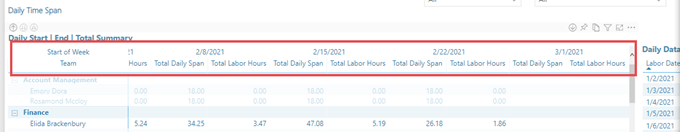 Based on our selection of all teams and all technicians, Item 2 shows the total daily span and total Labor Hours by week for each team and individual.