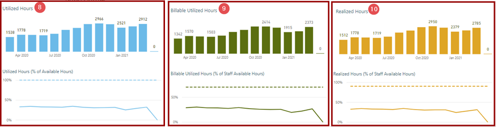 The charts below, numbered 8, 9 and 10 shows the trending over the last 12 months, with the line charts showing us the target and the % achieved against the staff available hours. The targets can be set for each of Utilized, Billable and Realized hours and against each team. One team may need to be 100% utilized (like sales) and another may be only 80% utilized (like a service desk who does hardware configurations)