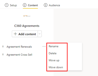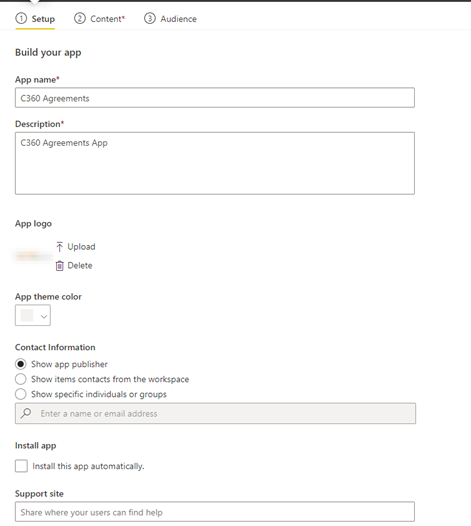 To update the app, click on the Update App button. This will open the following screen, which has three tabs/options at the top for Setup, Content and Audience.