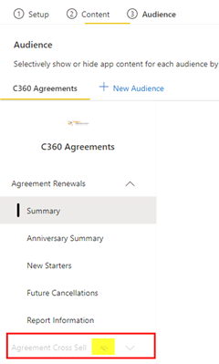 Once all the Content is confirmed, move to the Audience tab, see image below. To show a report for an audience, click on the eye icon and the report will become enabled. If you need to add a new audience, click on the + New Audience option. Audiences allow you to tailor the reports to different users, as in Users 1 get to see reports A, B and C and Users 2 get to see reports B, D and E. This can be a useful feature when you want to only give access to specific reports. Please note, the audience access is app only and will not limit access to workspace reports if the user has workspace access.