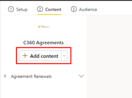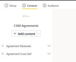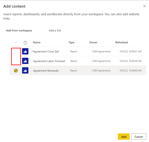 In the Content section, you will see the current reports available in the app. To include a new report, click on the Add Content option. This will open a new screen which will allow you to select and deselect reports for the app. To include/exclude a report hover over the area highlighted in the image below. This will allow you to select or deselect the reports.