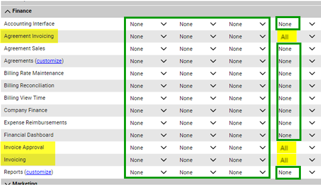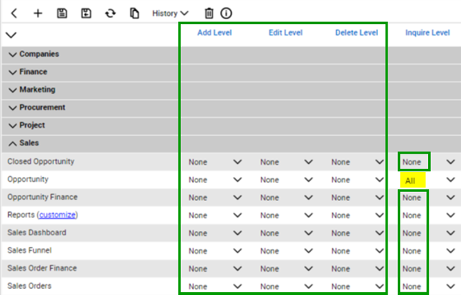 Items under Inquire Level - Items highlighted in yellow must be set to "All". All other options must be set to "None"