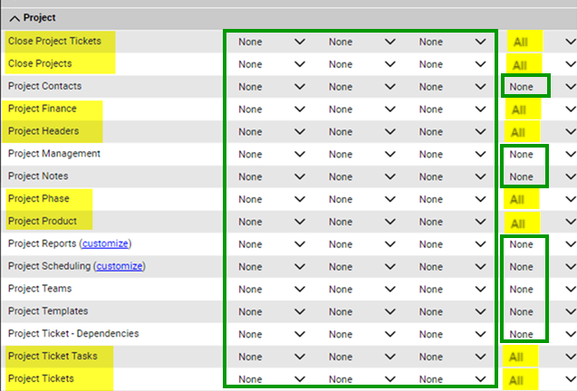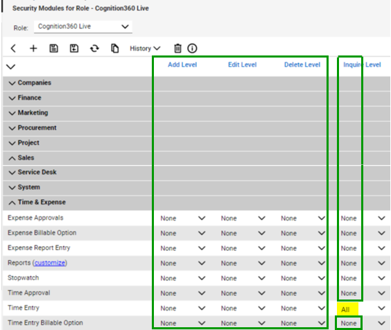 Drop down the Project Option. As before, under Add Level | Edit Level | Delete Level ensure that all options are set to "None" Items under Inquire Level - Items highlighted in yellow must be set to "All". All other options must be set to "None"